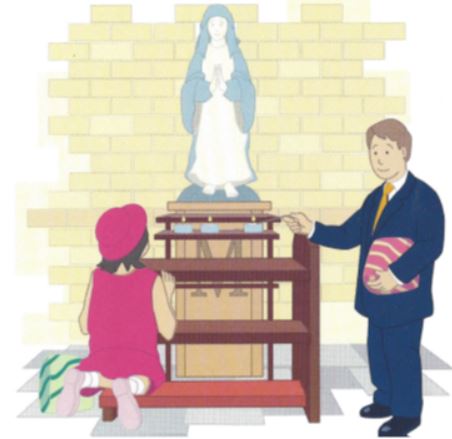 For those of you who wanted to do some thinking and preparation for today’s service during the preceding week, I invited reflection on the image of Mary mother of Jesus. In today’s picture from their book, Baptism Service, Aled and Sian visit their local Catholic church for their baby cousin’s baptism. There they light a candle before the statue of Mary.